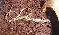 Males and females are similar, males being distinguishable by the presence of pre-anal pores. On average they grow to around 12 cm (4.7 in) snout-to-vent length, with the addition of a distinctive, prehensile long tail.[3] Some individuals may have small circular spots on the sides of the bodies. This species of lizard is often kept as a pet.