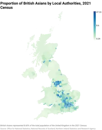 According to the 2021 United Kingdom census, those identifying as Asian British in England and Wales enumerated 5,515,420, or 9.3% of the population[69][70] In Northern Ireland, 30,667, or 1.6% of the population, identified as Asian or British Asian.[3] The census in Scotland was delayed for a year and took place in 2022, the equivalent figure was 212,022, representing 3.9% of the population.[2] The ten local authorities with the largest proportion of people who identified as Asian were: Redbridge (47.33%), Slough (46.75%), Harrow (45.23%), Tower Hamlets (44.43%), Leicester (43.40%), Newham (42.21%), Luton (36.99%), Hounslow (36.73%), Blackburn with Darwen (35.66%) and Hillingdon (33.32%). In Scotland, the highest proportion was in Glasgow at 11.08%; in Wales, the highest concentration was in Cardiff at 9.66%; and in Northern Ireland, the highest concentration was in Belfast at 3.74%.[71]
