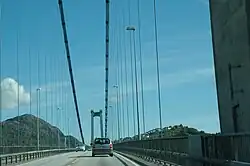 There are two main cables, one on each side, which consist of twenty locked coil cables in a seven wide and three tall matrix. Each strand has a diameter of 99 millimeters (3.9 in). The cable has a quality of 1,570 megapascals.[1] Each coil, which consists of 289 wires, can tolerate at least 9,060 kilonewtons (2,040,000 lbf) and weighs 71 tonnes (70 long tons; 78 short tons). The cables are anchored in rock 35 meters (115 ft) below the road level.[3] The main span's sag-to-span ratio is 1:10.[1] The bridge has a 200-meter (660 ft) wide clearance below of 62 meters (203 ft).[3] The bridge carries two lanes of County Road 562 across Byfjorden, between Storeklubben in Askøy and Brøstaneset in Bergen.[4] In 2010, the bridge had the daily average traffic of 17,251 vehicles.[2]