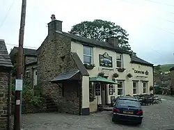 One of the local pubs, the Crown Inn, has been known under this name since the 1850s, and there has been an inn at this site since the late 18th century. The other pub, the Kings Arms Hotel, was built in 1767 as a coaching inn by John Pratt, a local who had made a fortune as a jockey. Pratt was a racehorse breeder and master of the Askrigg Harriers during the 18th century. He kept his hunters and pack of hounds in a yard behind the house he built on Askrigg's main street in 1767. The kennels and stabling date to the late 18th or early 19th century. The kennels had a semi-circular enclosure attached and the long row of stabling lay beyond. Pratt's hunters were ridden in and out of his land through Robinson's Gateways on the main street. The site has now been restored to provide holiday accommodation.[7]