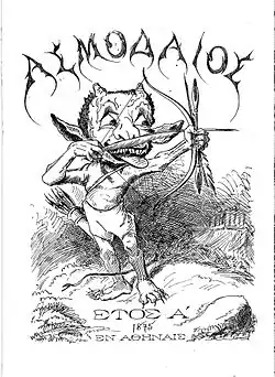 ![]() Front page of the first issue of Roides' satirical newspaper, Asmodaios (1875) | |