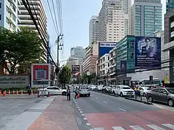 Asok Montri Road, or Soi Sukhumvit 21 (also Asoke Montri Road, Thai: ถนนอโศกมนตรี, RTGS: Thanon Asok Montri, pronounced [tʰā.nǒn ʔā.sòːk mōn.trīː]), is a major road in Bangkok, Thailand. It is often referred to as simply Asok or Asoke. It runs north from Sukhuvmit Road and forms part of the Ratchadaphisek inner ring road. It contains many offices buildings and shops. Although the road has a capacity of 35,000, more than 100,000 vehicles use the road daily, causing major congestion.[1] The junction of Sukhuvmit Road and Asok Montri Road is a major road junction known as Asok Intersection, and is also the location of Asok BTS station and Sukhumvit MRT station. In 2013 there were plans to build an elevated highway[2] but as of 2019 construction has not started.