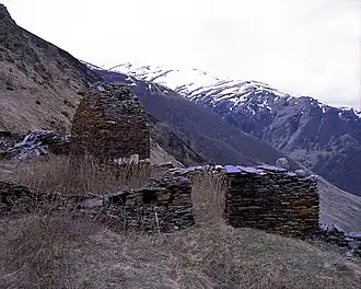 Rekom Temple in Tsey, Alagirsky District, North Ossetia–Alania. Dating back to the 2nd century BCE, and rebuilt numerous times throughout history (the latest in 1972 and 1995),[60] it is dedicated to Uastyrdzhi, and it is the site of a major festival celebrated in mid-June called Rekomy Bærægbon (Рекомы Бæрæгбон).[61] Being Uastyrdzhi the Lægty Dzuar (Лæгты Дзуар), "Patron of Men", the sacred space is forbidden to women, who perform their rites at a smaller temple nearby.[62]