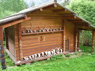 There are many shrines in Ossetia; the Alagir region alone has about three hundred of them.[35] In the village of Gaiat, in the region of Digoria of western Ossetia there is a temple dedicated to the cosmological seven deities.[66] These shrines are places where to make oaths, contracts, weddings, and where to identify violators of the divine law, the Ard.[35] Within the private household, the most sacred area is the khadzar (хждзар); it is the kuvandon of the house, where the hearth and the chain of the goddess Safa are located.[51] The sacred chain of Safa is also present at many public kuvandon.[35] Such chain symbolises the world tree which connects the three realms of sky, Sun and water/earth.[58]