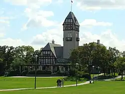 The park's signature feature, the Assiniboine Park Pavilion became a focus of early Winnipeg's social life. Originally designed by John D. Atchison and built in 1908, it included a dance hall, a banquet hall, lunch and catering. The 90-foot (27 m) tower contained the pump and water tower for the park's water system. It was destroyed by fire in May 1929. The current larger pavilion was designed by architects Northwood and Chivers, and was opened in May 1930. It is today one of Winnipeg's most familiar landmarks.[2]