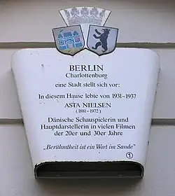 Joachim Ringelnatz, who was a frequent guest at Nielsens' home, wrote the poems "Über Asta Nielsen" (About Asta Nielsen) - for his 1928 collection Reisebriefe eines Artisten (An Artist's Travel Letters) [24] - and "Asta Nielsen weiht einen Pokal" (Asta Nielsen Dedicates a Trophy) in 1929.[25]