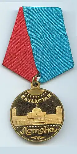 Astana Medal is a commemorative medal of the Republic of Kazakhstan established by Presidential Decree No.3963 dd. June 2, 1998 in celebration of the presentation of the new capital of Kazakhstan.[1][2]