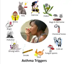 Asthma triggers are factors or stimuli that provoke the exacerbation of asthma symptoms or increase the degree of airflow disruption, which can lead to an asthma attack.[1] An asthma attack is characterized by an obstruction of the airway, hypersecretion of mucus and bronchoconstriction due to the contraction of smooth muscles around the respiratory tract. Its symptoms include a wide range of manifestations such as breathlessness, coughing, a tight chest and wheezing.[2]