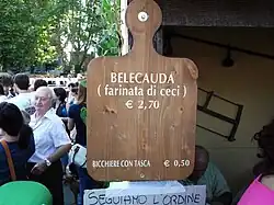 Both written and oral recipes created by generations of rural people are used each year to present a menu of over eighty different dishes, prepared using ingredients that are typical for the Asti region. Some are unusual, such as rice with Barbera d'Asti, Polenta with wild boar stew, rabbit agnolotti, fried bleak (alborelle - a type of fish), farinata (belecauda in Asti dialect of the Piedmontese language) or bollitto with bagnetto verde. Some dishes are prepared in almost industrial quantities - in 2004 over 4,000 kg of rabbit agnolotti were consumed - and are sold at affordable prices.