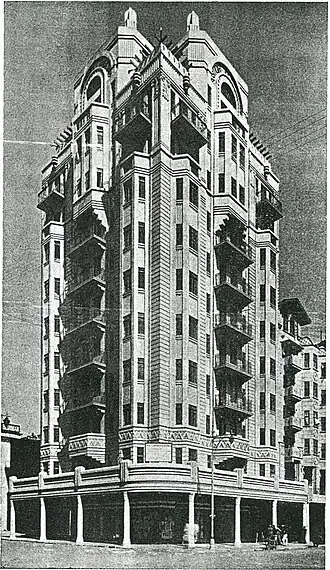 Astor Mansions is an Art Deco style building that was designed by architects Obel & Obel in 1931 and completed in 1932.[1] The building was residential with street level retail and first floor professional office space. It was built to the maximum height of 140 feet permitted by the City Council.[2] The building had a short lived stint as the tallest building in Johannesburg until the completion of the Ansteys Building in 1935.[3]