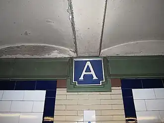 The walls in this station contain modern enamel artwork. The walls along the platforms near the fare control areas consist of a brick wainscoting on the lowest part of the wall, with bronze air vents along the wainscoting, and white glass tiles above. The platform walls are divided at 15-foot (4.6 m) intervals by buff brick tile pilasters, or vertical bands; the wall sections between each pilaster contain a border of blue mosaic tiles. In the original portion of the station, each pilaster is topped by yellow faience plaques depicting beavers, surrounded by green scrolled and foliate motifs. The beaver plaques are a reference to John Jacob Astor, whose fortune had been derived from the beaver-pelt trade.[4]: 4–5 [5]: 8 A faience cornice with green urn and vine motifs runs atop these walls.[4]: 4–5 [5]: 8 Cream-on-blue faience plaques with the words "Astor Place" are also spaced at various intervals on the walls, a deviation from the tile plaques seen at other original IRT stations. The platform extensions contain similar decorative elements, but the pilasters are made of tan ceramic tiles, and the wall sections between each pilaster contain a border of blue ceramic tiles. Within the platform extensions' pilasters are tiled plaques with the vertical text "Astor".[4]: 5 [43]: 82 There were maroon and gold tile Cooper Union signs underneath the tile Astor Place signs, which were destroyed during the renovation.[65] The mosaic tiles at all original IRT stations were manufactured by the American Encaustic Tile Company, which subcontracted the installations at each station.[59]: 31 The decorative work was performed by tile contractor Manhattan Glass Tile Company and faience contractor Grueby Faience Company.[59]: 33