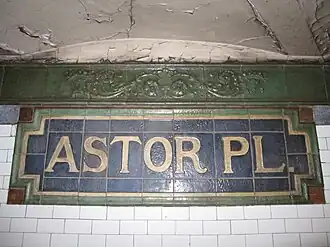 - ^ a b c d e f g h i j k l m n o p q r s t u v "New York MPS Astor Place Subway Station (IRT)". Records of the National Park Service, 1785 – 2006, Series: National Register of Historic Places and National Historic Landmarks Program Records, 2013 – 2017, Box: National Register of Historic Places and National Historic Landmarks Program Records: New York, ID: 75313927. National Archives.