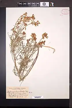 It had been collected by Thomas J. Howell who called it Astragalus collinus. Canby agreed it was closely allied to collinus, but easily distinguished based on leaves and pods, justifying creation of a new species.[2][3] Tweedy's specimen, the isolectotype, is deposited in Gray Herbarium at Harvard.[4]