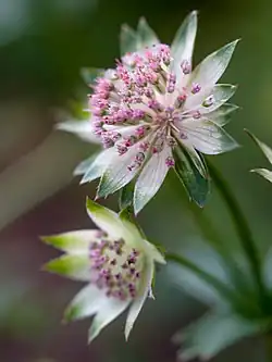 Astrantia is a genus of herbaceous plants in the family Apiaceae, native to Central, Eastern and Southern Europe and the Caucasus. There are several species, which have aromatic roots, palmate leaves, and decorative flowers. They are commonly known as great masterwort or masterwort which may also refer to other plants, particularly the unrelated Peucedanum ostruthium.