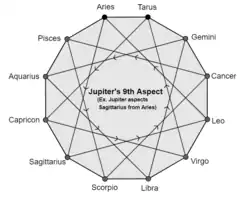According to the Tajika System,[6] that in practice is applied more to Varshaphal (Annual Chart) or a query-chart (Horary astrology), the planetary aspect on the 5th and the 9th houses from itself is very strong, openly friendly and helpful, e.g. if the Sun is in Aries and Jupiter is in Leo both will aspect each other producing very favourable results. The aspect on the 3rd and the 11th is secretly friendly but very helpful with the former being stronger, e.g. if the Sun is in Aries and Jupiter in Gemini with both though aspecting each other the aspect of Sun will produce more favourable results than Jupiter. The aspect on the 4th and the 10th is secretly inimical, when planets forming such an aspect tend to produce bad results and cause disappointments, and on the 7th openly inimical, these aspects are unhelpful and often destructive. Tajika aspects are deemed effective within 12 degrees either side of the aspected point. This principle is followed by Western astrology. Benefic aspects cast on the 2nd and the 12th give happiness but inimical aspect on 6th, 7th and 8th and on itself cause many hardships. Aspects of partial strength are not generally taken into account.[7]