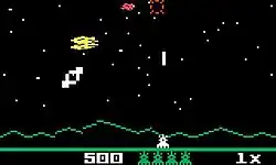 - UFOs cross the screen occasionally, beginning at level 4, firing non-guided salvos aimed at the player's laser cannon.