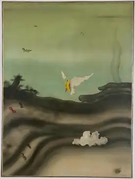 Tanguy presents us with a magical submarine world and its beyond. In the center hangs a pivotal being, a yellow-white shape of a bird half shell, each part distinct yet melting into the other, suggesting a possible metamorphosis ... When one looks closely at the painting's composition, it appears to be divided into an almost artificial geographic neatness. On the right side of the painting a stem like creatures drift toward the center, which only at second glance reveals itself to be a woman's form ... Tanguy so rarely included a woman in his paintings that her presence seems all the more significant.[4]