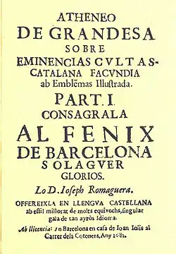 The Atheneo de Grandesa (Catalan pronunciation: [ətəˈnɛw ðə ɣɾənˈdɛzə], modern spelling Ateneu de Grandesa) is an emblem book written in the Catalan language by Josep Romaguera and published in 1681 by the printer Joan Jolis in Barcelona. It contains 15 engravings by an unknown artist.