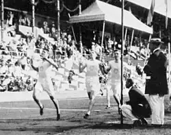 The men's 800 metres was a track and field athletics event held as part of the athletics at the 1912 Summer Olympics programme. It was the fifth appearance of the event, which is one of 12 athletics events to have been held at every Summer Olympics. The competition was held from Saturday, July 6, 1912, to Monday, July 8, 1912.[1] Forty-seven runners from 16 nations competed.[2] NOCs could enter up to 12 athletes.[3] The event was won by Ted Meredith of the United States, the nation's third consecutive victory in the 800 metres. Mel Sheppard became the first man to win two medals in the event, coming in second to miss out on defending his 1908 gold. Ira Davenport completed the United States sweep, the second time the Americans had swept the 800 metres podium (after 1904).
