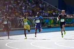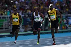 ![]() De Grasse, Bolt and Vicaut cross the finish line during the final of the Men's 100 metres | |||||||||||||