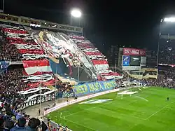 Simeone led Atlético to their second Europa League win in the three years since its creation; Atlético beat Athletic Bilbao 3–0 in the final on 9 May 2012 at National Arena in Bucharest with two goals from Radamel Falcao and one from Diego.[83][84] By winning the Europa League again, Atlético qualified for the 2012 UEFA Super Cup against Chelsea, winners of the previous season's Champions League. The game was played at the Stade Louis II, Monaco on 31 August 2012; Atlético won 4–1, including a hat-trick by Falcao in the first half. On 17 May 2013, Atlético beat Real Madrid 2–1 in the Copa del Rey final in a tense match where both teams finished with ten men. This ended a 14-year and 25-match winless streak in the Madrid derby. The 2012–13 season saw the club finish with three trophies in a little over a year.[85][86] On 17 May 2014, a 1–1 draw at the Camp Nou against Barcelona secured the La Liga title for Atlético, their first since 1996, and the first titles since 2003–04 not won by Barcelona or Real Madrid.[87] One week later, Atlético faced city rivals Real Madrid in their first Champions League final since 1974, and the first played between two sides from the same city. They took a first-half lead through Godín and led until the third minute of injury time, when Sergio Ramos headed in an equaliser from a corner; the match went to extra time, and Real ultimately won 4–1.[88]