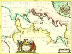 Atlante Veneto (1690–1701) was a comprehensive atlas published by the Franciscan geographer Vincenzo Maria Coronelli and intended as a continuation of the Blaeu Atlas Maior. This monumental work was published in thirteen folios and provided a wealth of detail covering ancient and modern cartographers and geographers, together with astronomical and historical data. These maps were engraved in a bold style and printed on fine white paper, the more important ones spread over two sheets, allowing for great detail.