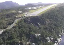 Stord Airport, Sørstokken is a municipal, regional airport located on the peninsula of Sørstokken on the island of Stord at an elevation of 49 metres (161 ft). The runway, aligned 14/32 (roughly north-north-west and south-south-east) is 1,460 metres (4,790 ft) long and 30 metres (98 ft) wide. It has thresholds 130 metres (430 ft) on each end and a landing distance available of 1,200 metres (3,900 ft).[6] At both ends of the runway the ground slopes steeply downwards. This was sufficient safety area according to requirements at the time of the airport's construction, but the requirements had been changed by the time of the accident.[7] The runway was presumed to be damp at the time of the accident, although such information was not relayed to the pilots.[8]