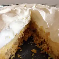 The pie uses a crust containing saltines, butter, and sugar and a curd containing lemons or limes, condensed milk, and egg yolks.[1][5] The curd is topped with a sweetened whipped cream and then finishing salt and/or lemon zest.[1] The pie is notable for the speed and ease with which it can be made.[6]