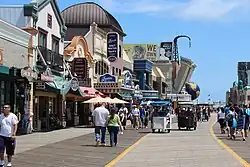 The first boardwalk was built in 1870 along a portion of the beach in an effort to help hotel owners keep sand out of their lobbies. Businesses were restricted and the boardwalk was removed each year at the end of the peak season.[39] Because of its effectiveness and popularity, the boardwalk was expanded in length and width, and modified several times in subsequent years.