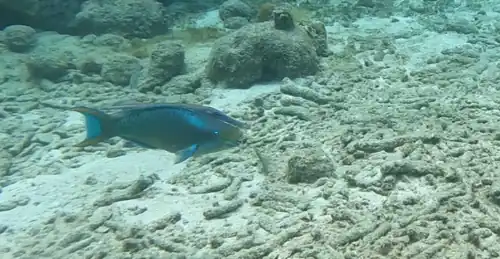 It has the ability to change colour, either to communicate their excitement or to camouflage them. The most frequent colours recorded are brown or even blue, green or orange tones, or intermediate shades. It can display a pattern of pale, vertical and / or horizontal lines, or a dark mottling on the body. The dorsal and anal fins are semitransparent with a black dot in front of it. Typically it has a pattern of four white spots on the body, between the dorsal and anal fins; three white vertical lines in the long caudal peduncle and a black, submarginal, in each margin of the caudal fin dot.