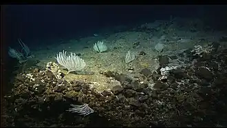 ![]() The seafloor of the Atlantis Massif, showing white corals and an apparent spotted fish | |