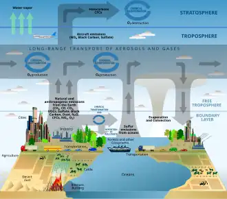 Atmospheric chemistry plays a major role in understanding the concentration of gases in our atmosphere that contribute to climate change. More specifically, when combined with atmospheric physics and biogeochemistry, it is useful in terms of studying the influence of greenhouse gases like CO2, N2O, and CH4, on Earth's radiative balance.[4] According to UNEP, CO2 emissions increased to a new record of 57.1 GtCO2e, up 1.3% from the previous year. Previous GHG emissions growth from 2010-2019 averaged only +0.8% yearly, illustrating the dramatic increase in global emissions. The Global Nitrous Oxide Budget cited that atmospheric N2O has increased by roughly 25% between 1750 and 2022, having the fasted annual growth rate in 2020 and 2021.[5] Atmospheric chemistry is critical in understanding what contributes to our changing climate. The warming of our climate is caused when CO2 emissions, constrained by biogeochemistry, are above a 0% increase. In order to stop temperatures from rising, there must be no CO2 emissions. By understanding the chemical composition and emission rates in our atmosphere alongside economic factors, researchers are able to trace back emissions back to their sources. About 26% of the 2023 GtCO2e was used for power, 15% for transportation, 11% in industry, 11% in agriculture, etc.[6] In order to successfully reverse the human-driven damage contributing to global climate change, cuts of nearly 42% are needed by 2030 and are to be implementing using government intervention. This is one example of how atmospheric chemistry goes hand-in-hand with social and political policy, biogeochemistry, and economic factors.