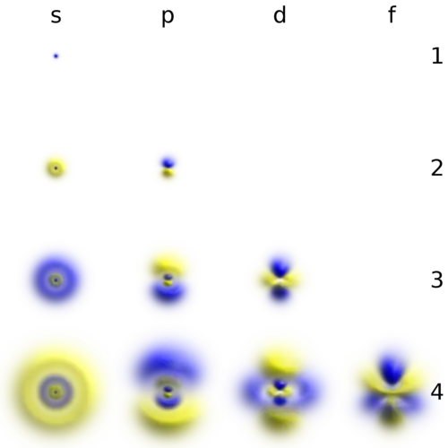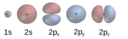 Electrons, like other particles, have properties of both a particle and a wave. The electron cloud is a region inside the potential well where each electron forms a type of three-dimensional standing wave—a wave form that does not move relative to the nucleus. This behavior is defined by an atomic orbital, a mathematical function that characterises the probability that an electron appears to be at a particular location when its position is measured.[51] Only a discrete (or quantized) set of these orbitals exist around the nucleus, as other possible wave patterns rapidly decay into a more stable form.[52] Orbitals can have one or more ring or node structures, and differ from each other in size, shape and orientation.[53]