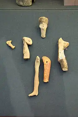 The votives also demonstrate the purposes of the sanctuaries. The clay figurines, which included animals, anthropomorphic forms and votive limbs, corroborates the idea that this sanctuary's purpose was healing.[7] The worshipers deposited the human figures which were symbolic of themselves at the sanctuary.[8] The votive limbs specifically reflected gratitude for the healing through a performative aspect of prayer.[8] At other Minoan peak sanctuaries, votive limbs and human figures are used by similar healing cults.