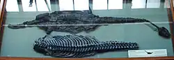 The original remains of the holotype, specimen, were discovered in Charmouth, Dorset, England in 1880[3] and was described in 1881.[2] This original specimen was housed at the Bristol City Museum and Art Gallery[2] where it stayed until it was destroyed in November 1940, during World War II.[1] Thankfully, before the war, a cast had been made by William Johnson Sollas, c. 1888 and sent to the Natural History Museum in London. This specimen (specimen NHMUK PV R1339) is still housed at the Natural History Museum, London along with two referred specimens: specimen NHMUK OR 39514 which includes part of the skull; and specimen NHMUK OR 40140 which includes a skull and postcrania and was purchased by E.C. Day in 1866, also from Dorset.[3] Specimens NHMUK PV R 1339 and NHMUK OR 40140 are both on public display in Fossil Way at the museum (although NHMUK OR 40140 is mislabeled as "40140/R1360").