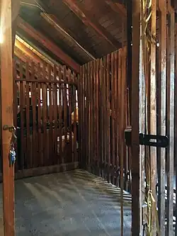 Lockable storage compartments with fence-like wooden walls in the attic of a German apartment house from the 1950s; there is one such space for each of the ten apartments