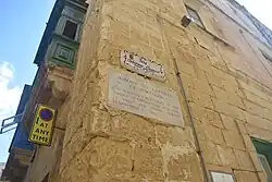The first Auberge de Castille, which was known as the vecchia alberghia di Castiglia, was built in the 1530s. Its exact location is not known and no remains have survived of this first auberge. A second auberge was built in Barrack Front Street (now Hilda Tabone Street) during the magistracy of Grand Master Claude de la Sengle. This auberge was designed by the architect Niccolò Bellavante in the traditional Maltese style, and it housed the langue until the building of a new Auberge de Castille in Valletta in 1574. The building still exists, but it has been heavily altered over time, and only a quoin and some windows with Melitan mouldings remain of the original auberge.[1] The building is privately owned.[2]