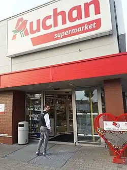 After meeting the founders of the Carrefour and Leclerc,[12] on 6 July 1961, Gérard Mulliez opens the first Auchan store in a disused factory of the company Phildar, founded by his father, also named Gérard.[13] Covering an area of 600 m2, this store was located in the district of Hauts-Champs, in Roubaix. Originally, the store was to be called "Ochan", but because of the Japanese sounding, changed the name to "Auchan".[14] The choice of the initial letter "A" was desired by the founders to appear in first place in directories. Gérard Mulliez relied on the advice of Édouard Leclerc to open his first supermarket. This store had to be closed in the 1980s because of strong competition with the one that had been built in Leers. The building was bought by the Intermarché. In 2003 it was demolished to make space for a more modern store.