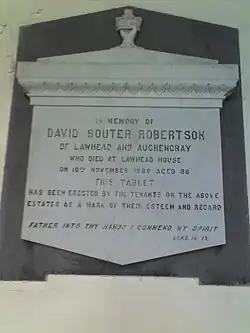 It has a small church whose architect was Frederick Thomas Pilkington (1832–98), the ground given by George Robertson Chaplin (proprietor) of Colliston House, Arbroath, the uncle of David Souter Robertson of Lawhead House nearby, and Murlingden House. The church has two stained glass rose windows, one of which has a spelling error in "Haleluya," though correctly spelled in the original transliteration of the Hebrew הללויה. White marble memorial stones to GRC and DSR, erected by their tenants, are on the back wall.