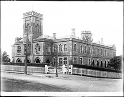 Construction on the courthouse began in 1865, and was halted due to the original builder going bankrupt. Work on the structure was taken up again by Mathews and Bartley, and the building was completed in 1867.[2] The red brick building was designed by Australian architect Edward Rumsey, who was a student of George Gilbert Scott.[3][2] Rumsey's Gothic Revival design included features such as crenellated towers and gargoyles, which were carved by Prussian ship carpenter Anton Teutenberg, in designs representing judges and major dignitaries of the 1860s.[3] From 1935 to 1936 the building was extended.[1] The courthouse was originally called the Auckland Supreme Court, but the name was changed in 1980 to make way for the naming of an eventual new Supreme Court of New Zealand.[4][5][3] In 1988 part of the original building was demolished to expand the courthouse.[1]