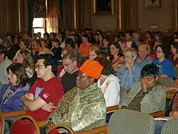 An ideal audience is a rhetor's imagined, intended audience. In creating a rhetorical text, a rhetor imagines is the target audience, a group of individuals that will be addressed, persuaded, or affected by the speech or rhetorical text.[9] This type of audience is not necessarily imagined as the most receptive audience, but as the future particular audience that the rhetor will engage with. Imagining such an audience allows a rhetor to formulate appeals that will grant success in engaging with the future particular audience. In considering an ideal audience, a rhetor can imagine future conditions of mediation, size, demographics, and shared beliefs among the audience to be persuaded.[10]