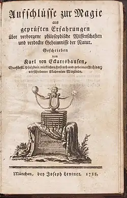 - ^ a b Von Eckartshausen, Karl (1788). Aufschlüsse zur Magie asu geprüften Erfahrungen über verborgene philosophische Wissenschaften und verdeckte Geheimnisse der Natur, Erstes Buch. Munich.