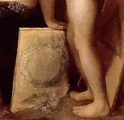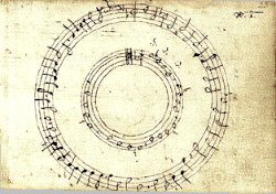 Another instance of eye music in the Renaissance is apparently unique—the representation of a triangle for a canonic piece, which appears in juxtaposition with an anonymous canon written in a circle—in Dosso Dossi's Allegory of Music.[6] (It has been suggested that both the technique of canon itself as well as its representation—the circle and the inherent symbolism of the tenets of Christianity in the triangle—also imply a "sense of the infinite.")[7] The work represented in the triangle, is part of a "rough" version of a puzzle canon in Josquin's Agnus Dei II from his Missa L'homme armé super voces musicales canonic mass. It has the superscript "trinitas in un[um]" ("three in one") as a clue to its solution, is a mensuration canon of 3:1, and has one voice take part at the interval of a fifth, that is, 3:2. Its relation to the Christian Holy Trinity is clear, suggesting the use of a triangular representation. The representation is unique, although possibly from a copy used by Dossi.[8]