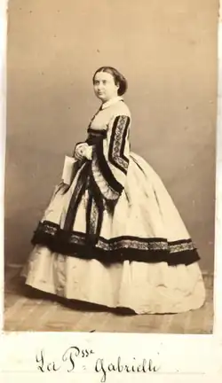 After 1870, Placido and Augusta, who had no children, moved to Rome. In the newly-proclaimed Italian capital Augusta was renown for her dedication to the poor and for the charity fairs she organized at her residence at Palazzo di Monte Giordano.[4] She also helped the rural populations of her husband's fiefs in southern Latium (Prossedi, Roccasecca and Pisterzo). Nowadays, Prossedi's main road is dedicated to her as via Principessa Augusta Gabrielli. She also worked at the catalogue of her husband's family painting collections and decorated several rooms of her Roman residence: when a new tower was added to the palace, Placido dedicated it to her as Torre Augusta. She also hosted her brother, cardinal Lucien Bonaparte at Palazzo Gabrielli, where he died in 1895. When the building was sold in 1888, most furnishings were donated to the couple's cousin Giuseppe Primoli and are now included in the collections of the Museo Napoleonico in Rome. The donations included her mother-in-law's portrait by Jean-Baptiste Wicar (Carlotta Bonaparte Gabrielli as a young peasant woman).[5]
