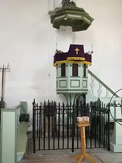 Augusta was buried under the floor of Kullamaa Church.[31] On her tombstone is the text: "Hic jacet in pace Augusta Carolina Friderica Luisa Ducis Brunsuicencis-Guelferbytani Filia Friderici Guilielmi Caroli Ducis Vurtembergensis et Supremi Praefecti Viburgiensis Uxor Nat. d. III. Dec. MDCCLXIV Denat. d. XIV. Sept. MDCCLXXXVIII"[32][33] The date is false - it should have been XVI September. Over the years, her coffin decayed, causing her bones to get lost in the bottom of the deep crypt. Her tombstone is still in the church, albeit in a different position, surrounded by an iron rail.[34]