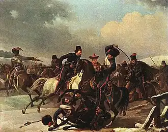 In 1815, he presented some of his paintings at the Imperial Academy of Arts, depicting various activities of the Russian cavalry. One of them showed a horseman pursuing a French carabinier and, on the basis of this picture, he was elected to the Academy.[2] Two years later, he presented more paintings with the hope of being named an "Academician", but the judges found these works to be unsatisfactory. In 1827, he was finally granted that title for a work depicting himself being captured.