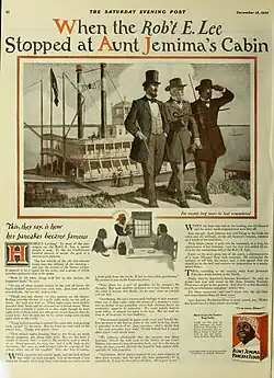 At that World's Fair, and for decades afterward,[35] marketers created and circulated fictional stories about Aunt Jemima.[9] She was presented as a "loyal cook" for a fictional Colonel Higbee's Louisiana plantation on the Mississippi River.[9][38][39][40] Jemima was said to use a secret recipe "from the South before the Civil War", with their "matchless plantation flavor", to make the best pancakes in Dixie.[35][39] Another story described her as diverting Union soldiers during the Civil War with her pancakes long enough for Colonel Higbee to escape.[38] She was said to have revived a group of shipwrecked survivors with her flapjacks.[9]