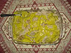 Aush is typically made with a variation of ingredients but may include; flat wheat noodles, turmeric, vegetables (broccoli, carrots, onion, celery, spinach, garlic, jalapeño), legumes (chickpeas, kidney beans), herbs (dill, mint, coriander, minced cilantro), yogurt and ground lamb, beef or chicken.[3][4][5][6]