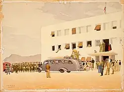 In the meantime, the New Zealand Government was considering appointing an official war artist to record the exploits of New Zealanders serving with the military. Deans had already been interviewed for the position the previous year and his application was supported by many in New Zealand, particularly from the Canterbury region. His mother even wrote to the Prime Minister Peter Fraser advocating for her son. Deans had been interviewed by the commander of 2NZEF, Major General Bernard Freyberg, the previous year but the position would eventually go to Peter McIntyre.[11] However, shortly after Deans' arrival on Crete, he was told that he had been appointed assistant war artist. His first task was to paint depictions of New Zealanders serving in Greece, as McIntyre had not been present for that campaign. Although he was offered the opportunity to return to Egypt to start his work there, he preferred to remain on Crete.[12] He was therefore caught up in the invasion that commenced on 20 May 1941. Paintings already worked up by that stage were in transit to Egypt and would duly arrive in New Zealand. In the meantime, Deans was badly wounded; he had inadvertently set off a land mine and had to be hospitalised with his legs full of shrapnel.[13] A few days later, and unable to be evacuated, he was one of 520 wounded New Zealanders to be captured by the Germans.[14]