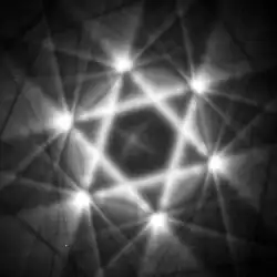 Convergent beam electron diffraction (CBED) transmission electron micrograph of a [111] zone axis of austenitic stainless steel